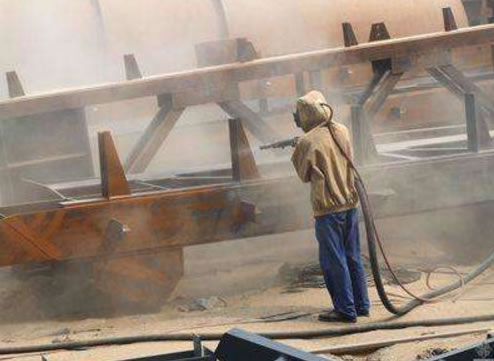 在可以停產(chǎn)進行施工維護的工程中,可以采用噴砂除銹。通過噴砂機將鋼結構構件天面的鐵銹清除干凈,露出金屬的本色。較好的噴砂機能夠將噴出的石黃砂、鐵砂或鐵丸的細粉自動篩去,并防止粉塵飛揚,減小對操作者健康的影響。這種方法除銹徹底。效率也較高,在發(fā)達國家已普遍采用,是一種較先進的除銹方法。