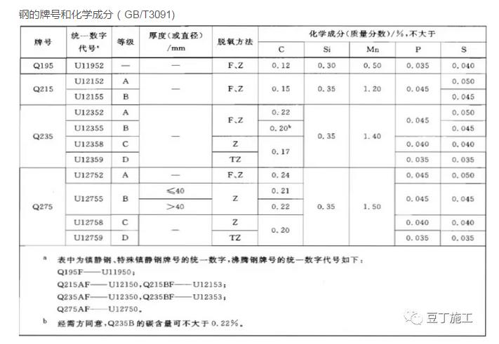 (1)一般鋼    a.碳素結(jié)構(gòu)鋼:(a) Q195;(b) Q215(A、B);(c) Q235(A、B、C);(d) Q255(A、B);(e) Q275。    b.低合金結(jié)構(gòu)鋼    c.特定用途的一般結(jié)構(gòu)鋼
